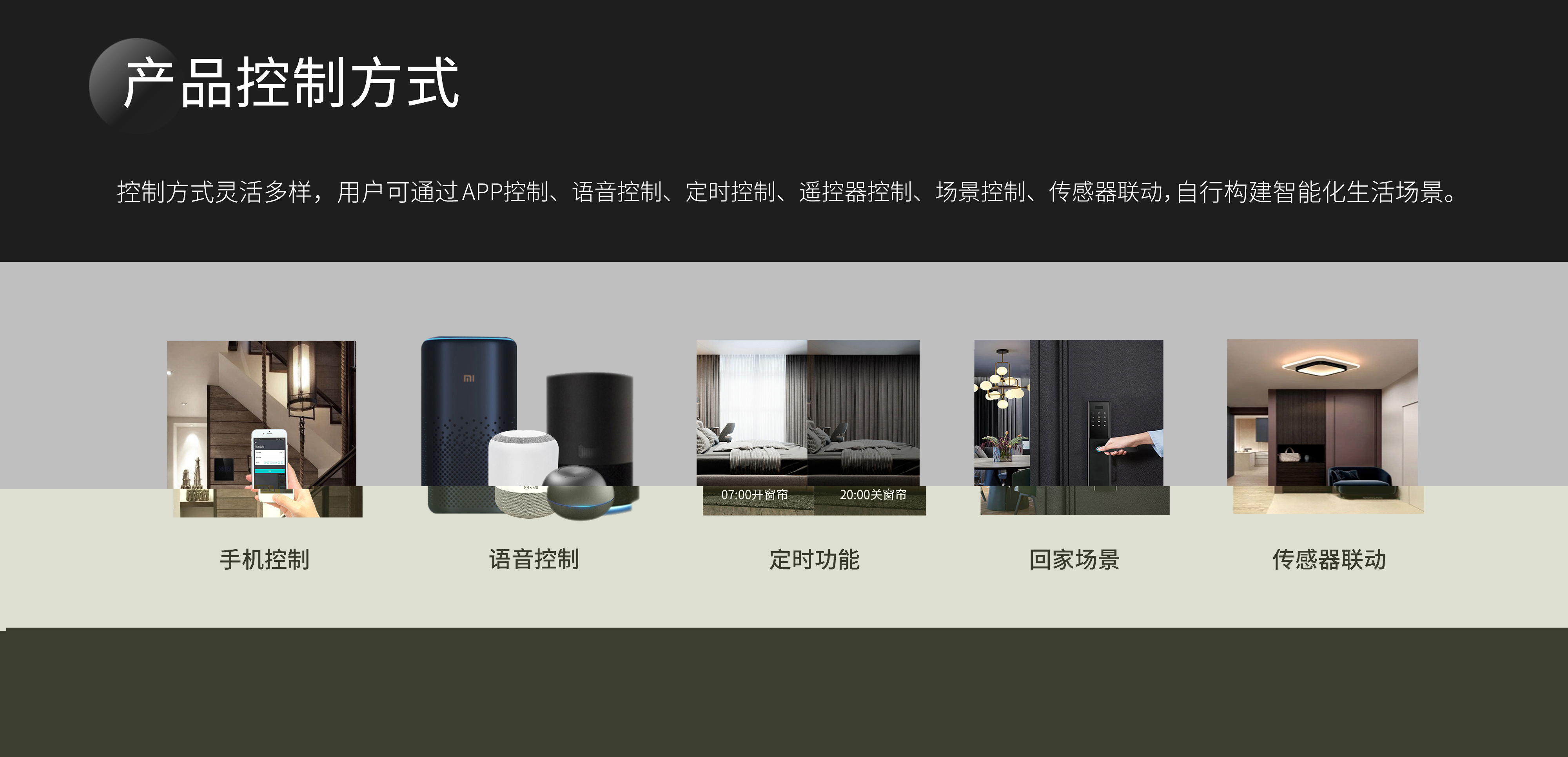 我们整套系统有多种控制方式:APP控制、语音控制、定时控制、遥控器控制、场景控制、传感器联动。