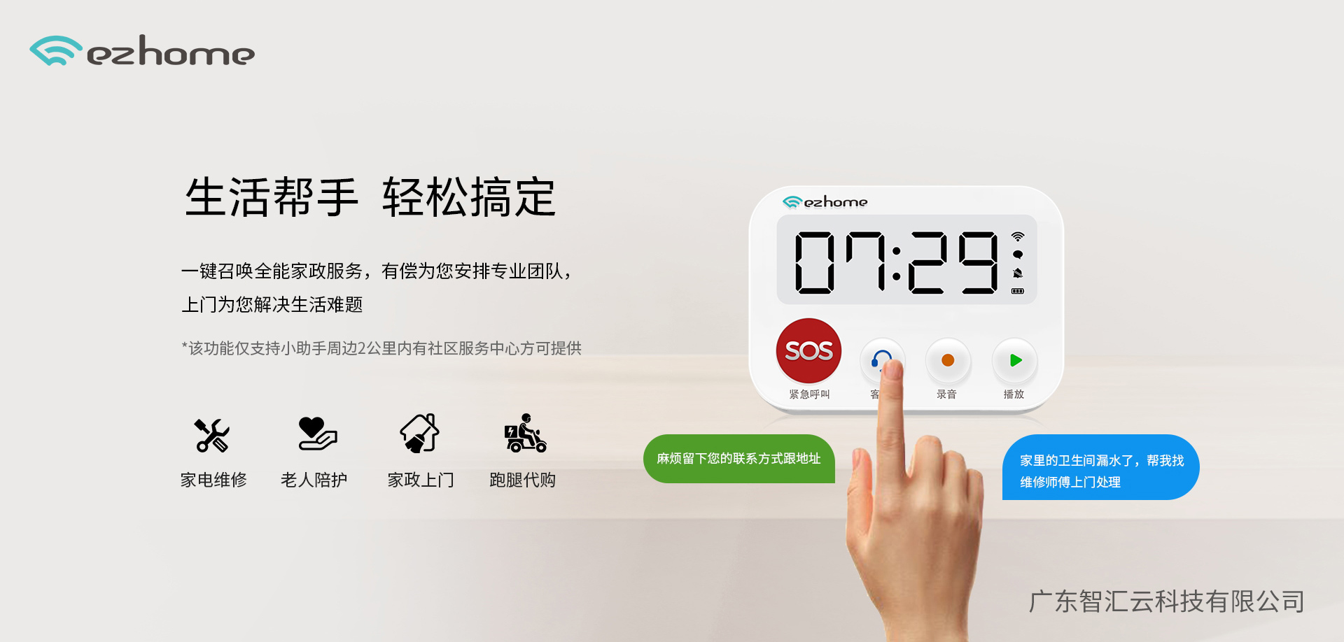 设备集成了一键服务功能,老人按下服务键即可联系专业家政服务,涵盖老人陪护、家电维修、跑腿代购等日常需求。