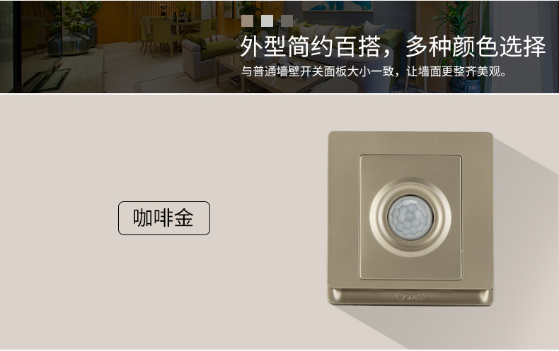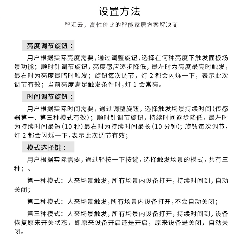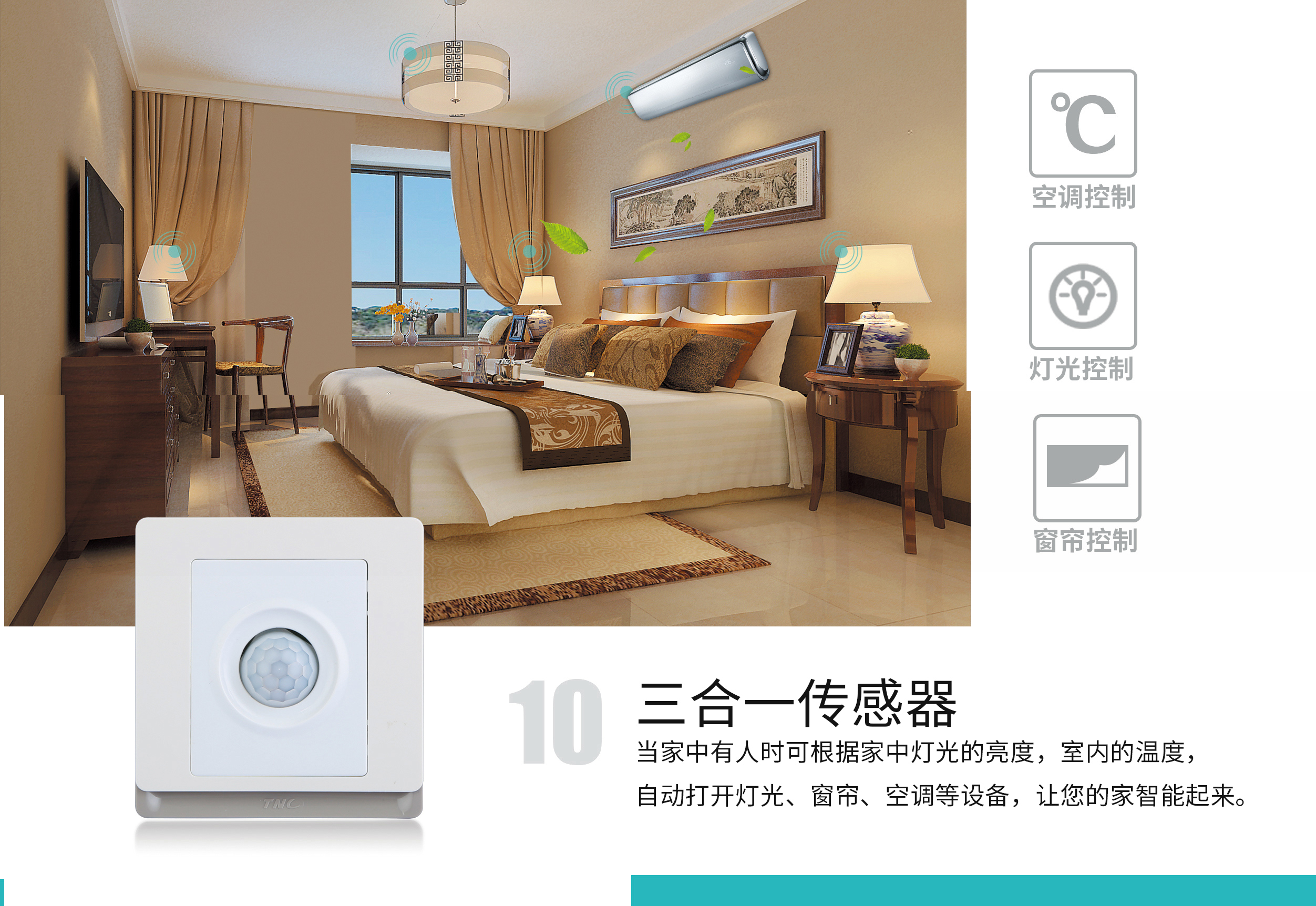 三合一传感器内置了温度、亮度、移动检测3个传感器,可根据灯光的明暗、温度的高低、是否有人来判断是否执行开关灯、开空调、开窗帘等