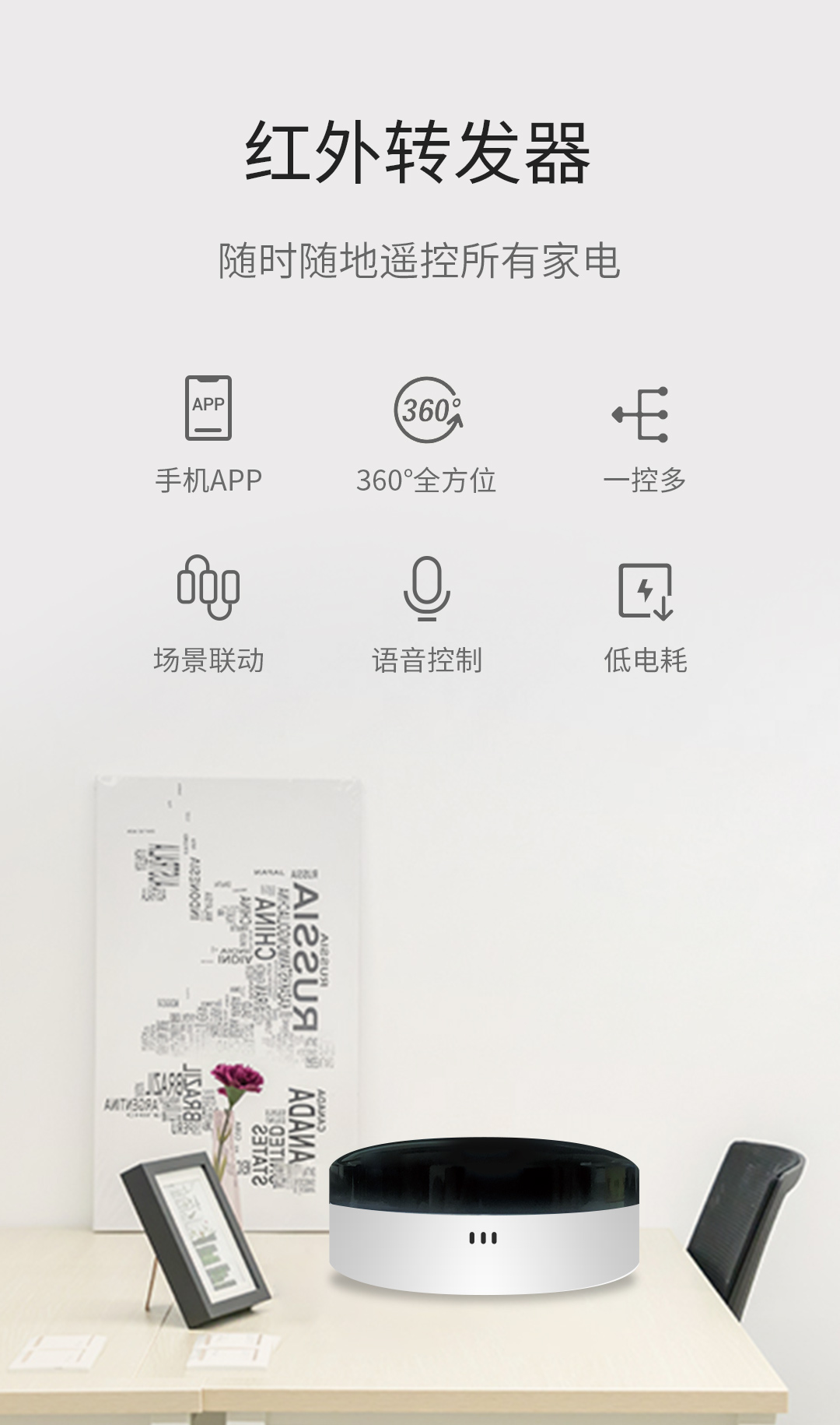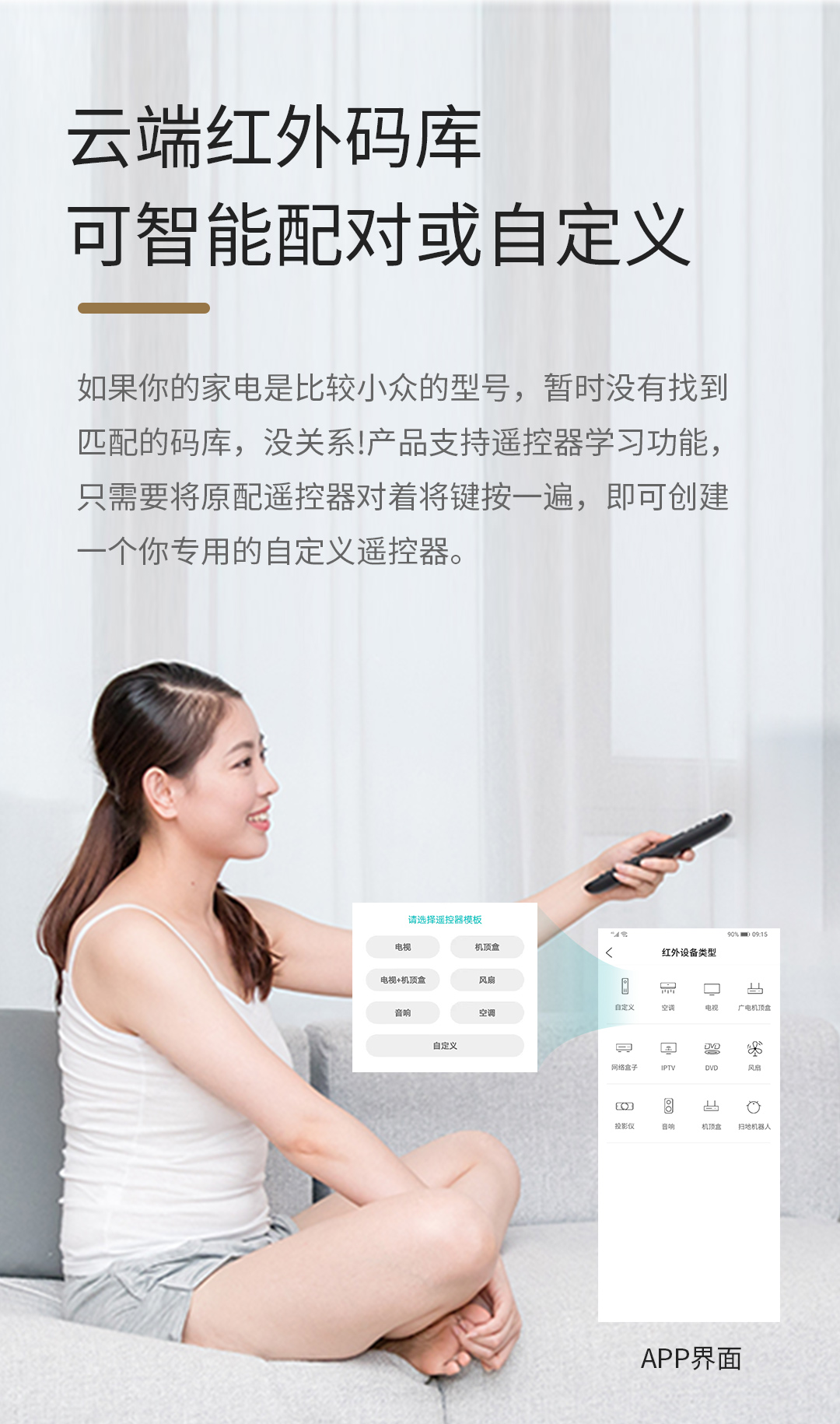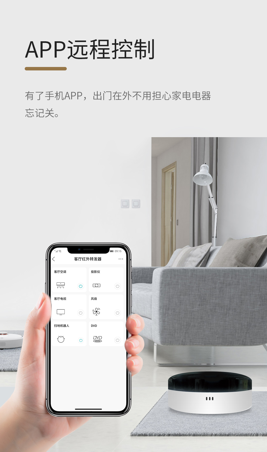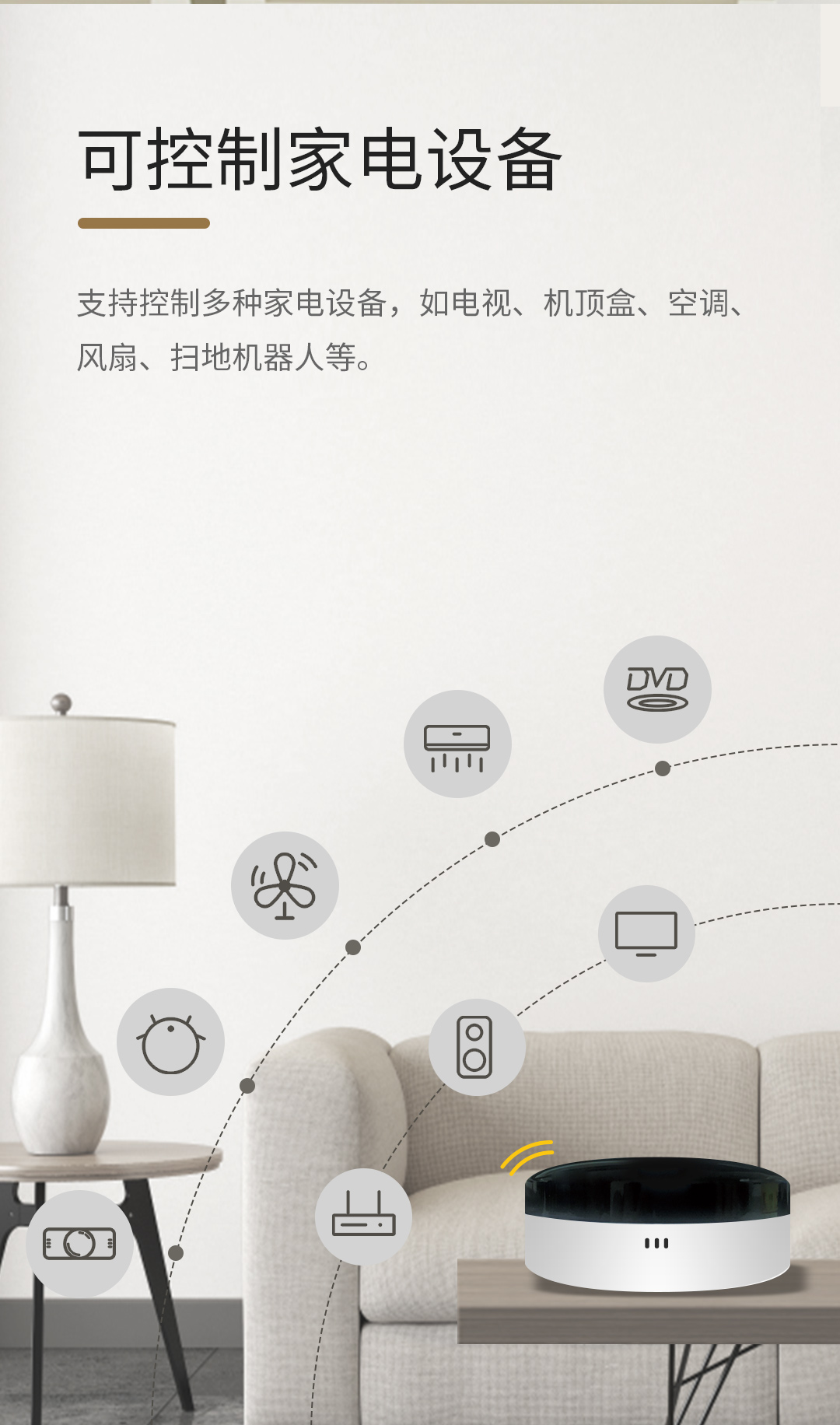 随时随地控制家中所有红外类设备家电,像空调(中央空调暂时不支持),电视等家电。