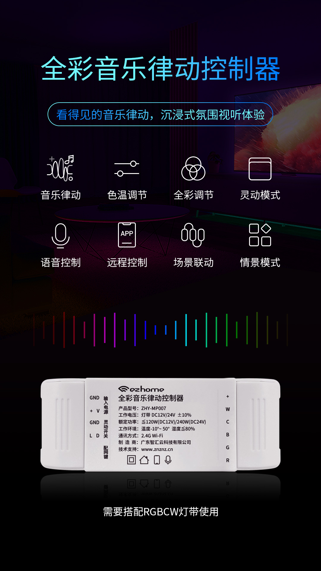 全彩音乐律动控制器除了可以实现灯光冷暖色温/亮度调节、RGB全彩调光、一键切换不同灯光模式等功能。