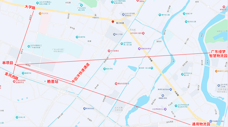 地理位置优越,距离粤东城际铁路-赖厝站1公里,距离潮汕环线高速鮀莲站5公里,距离在建牛田洋快速1.5公里,南距离金凤西路300米,北距大学路1.2公里无缝连接城市交通动脉; 30分钟通达市中心、机场及物流效率领先。距离汕头绿梦智慧物流园区4.1公里,距离通用物流园4公里,物流方便快捷促进园区项目资源要素快速流动。