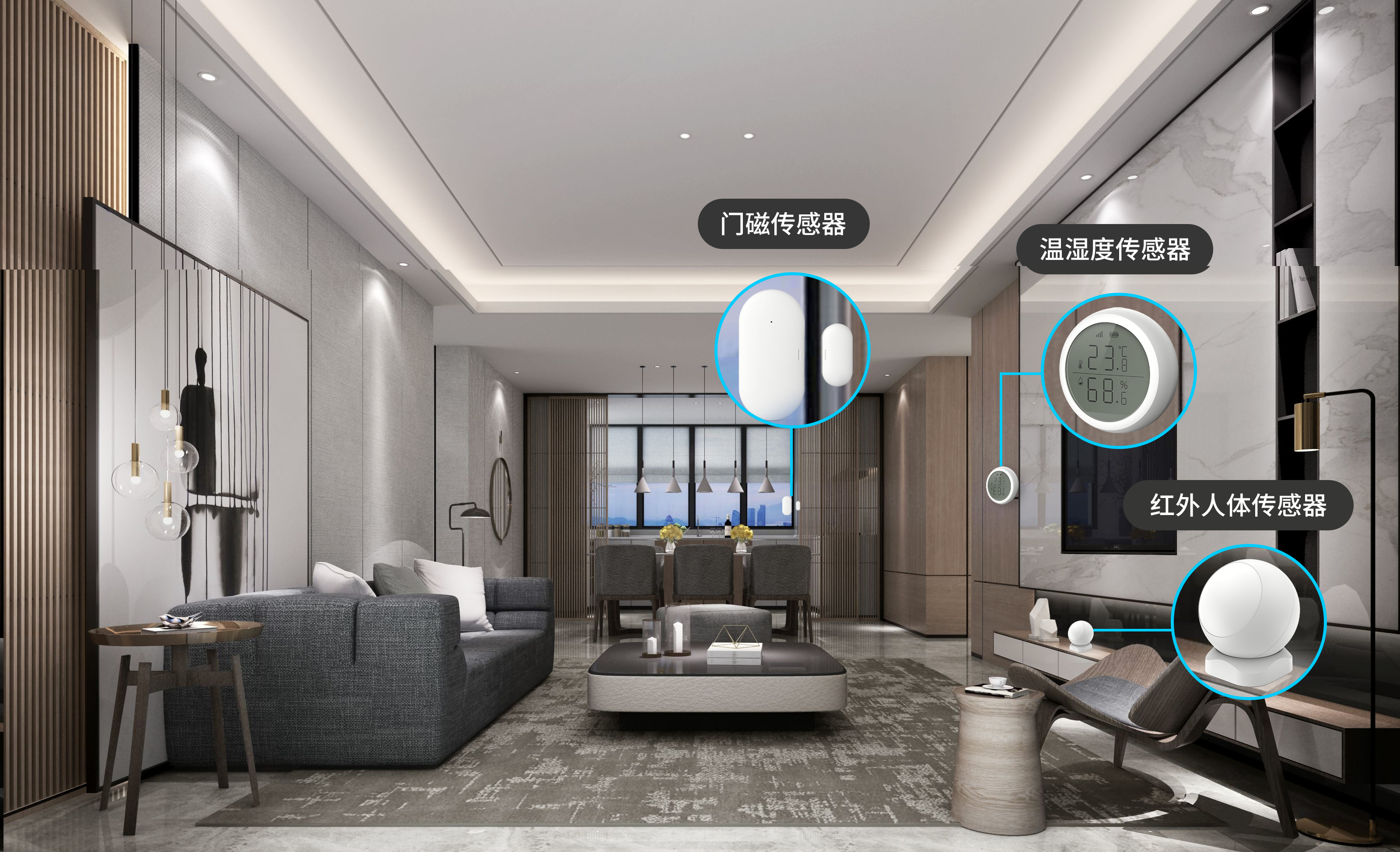 传感器监测周围环境,智能联动空调、空气净化器、智能开关、窗帘等其他设备。例如红外人体传感器感应人的移动来联动其他智能设备。如需在夜间起来,将红外人体传感器放置在床头柜旁,一旦探测到有人下床,自动打开台灯或夜灯,从洗手间回来后,回到床上,30秒未检测到人体移动,灯光会自动关闭。温湿度传感器感应场景的温度湿度,例如空间里的温湿度太高或太低,会自动联动打开空调开启工作。门窗传感器既可以感应门窗的开闭情况,还可以在夜间时候若感应到门窗开闭异常情况,启动布防模式并推送手机信息进行提醒。
