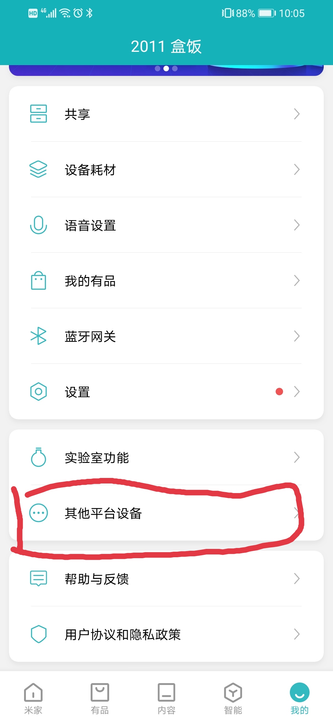 1、 打开“米家”APP,点击下方“我的”栏,点击“其他平台设备”;