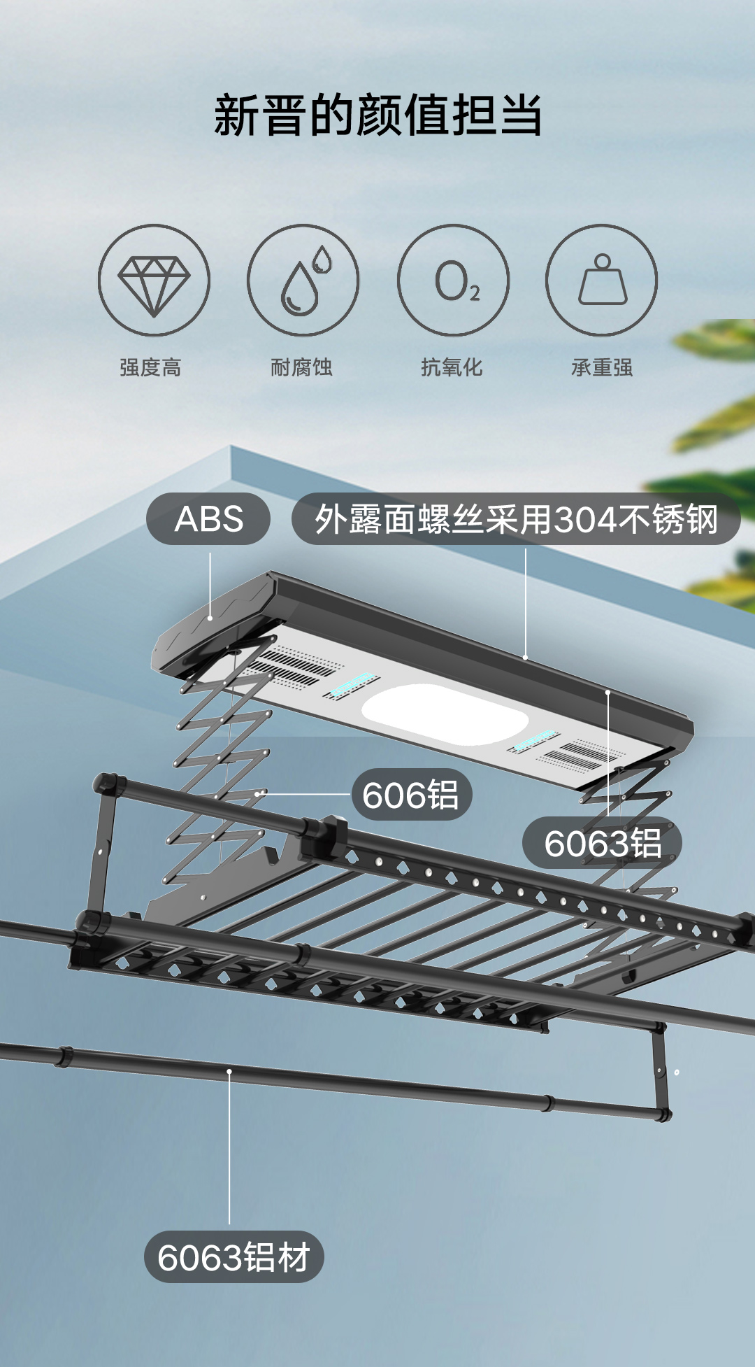 配备12W LED照明灯,柔光不刺眼,集晾衣、照明一体化,从此无死角广角照明,不惧衣物遮挡,阳台既明亮又不会造成光能浪费,也可以省电。