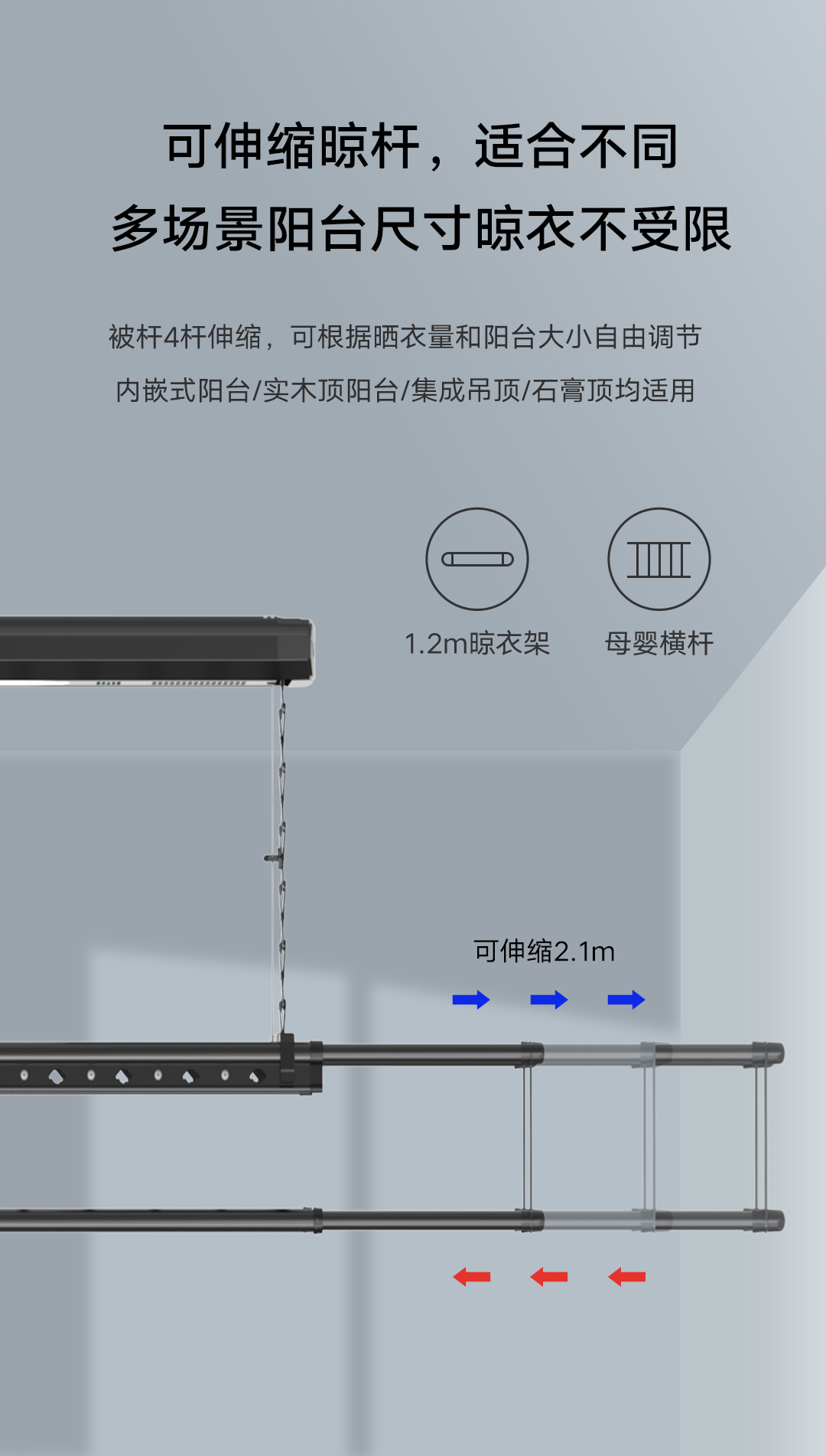 精致小巧的机身,在设计上,用极简线条勾勒了完美机身。配备了1.2m到2.1m伸缩晾衣杆、母婴横杆,杆子上的多挂钩设计更是最大限度的利用了机身空间,被杆4杆伸缩,让小阳台也可以承载更多的实用功能。