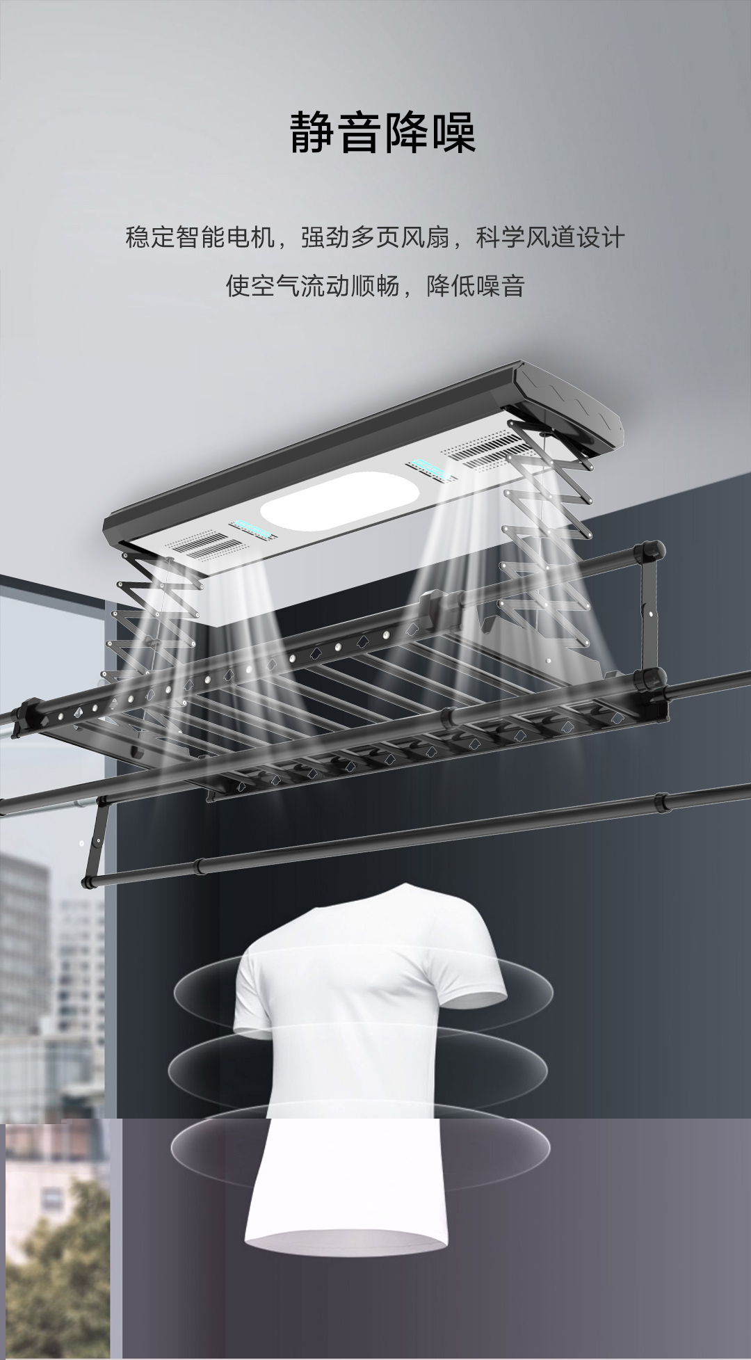 采用了降噪专利技术,利用电源管理芯片将运行状态的噪音降低到耳朵舒适的状态,即便是晚上晾晒衣服,也不会吵到家人。