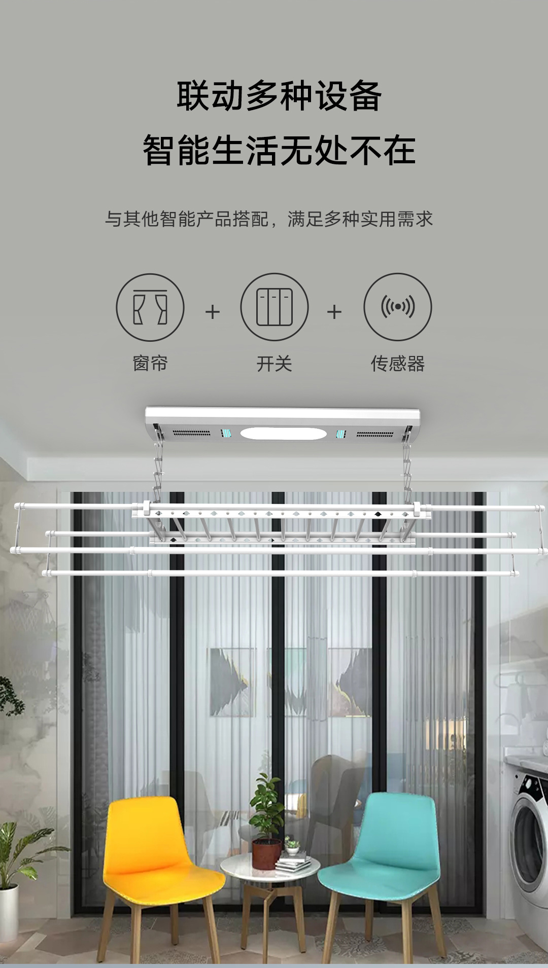 用户在进行智能晾衣架升降的同时亦可同步联动开启或关闭全屋其他场景,例如实现一键联动灯光、窗帘、家电等,带来更便捷的智能家居体验。