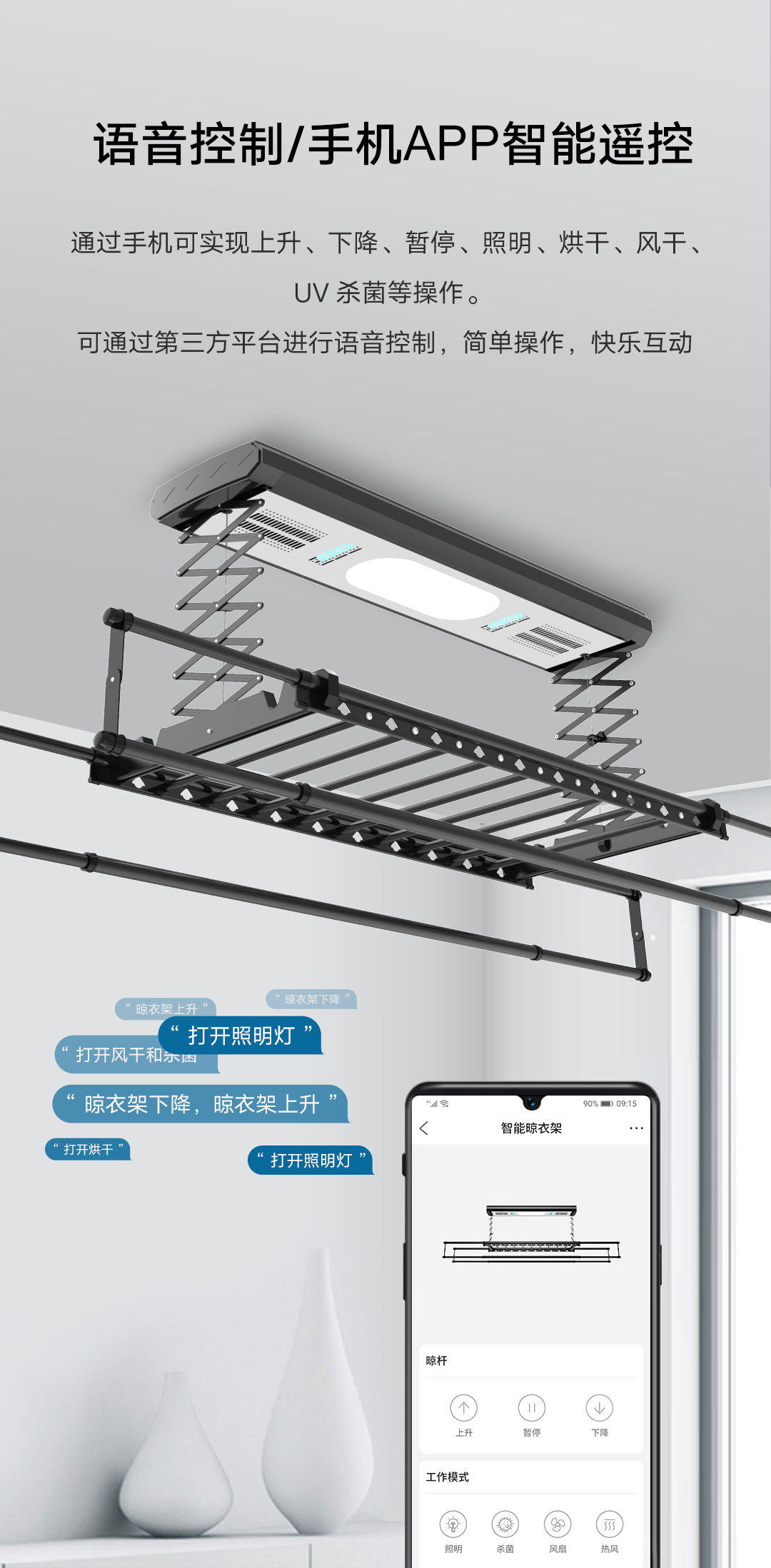 用户可通过遥控、手机实现上升、下降、暂停、照明、烘干、风干、UV杀菌等操作,还可通过第三方平台进行语音控制。