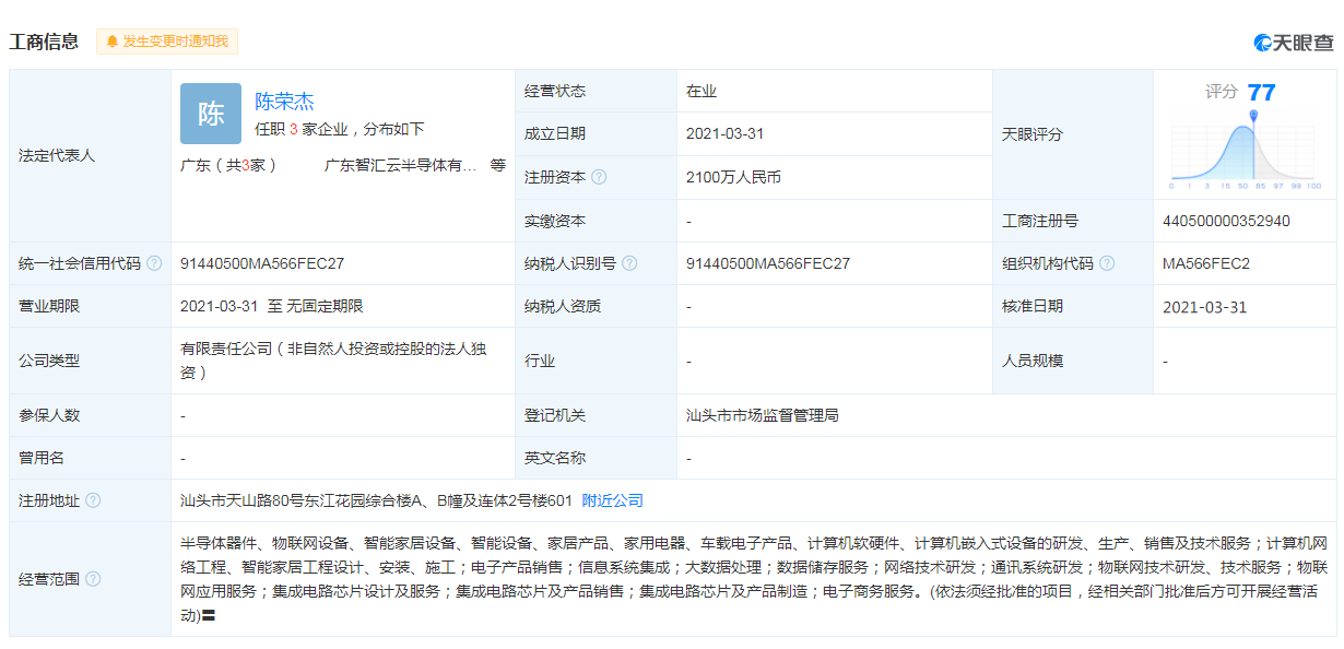 深圳市3499拉斯维加斯科技有限公司(下称:3499拉斯维加斯)作为全屋智能家居系统领导品牌,始终保持对领先科技的敏感嗅觉,深耕AI、IOT等前沿领域。随着业务的发展不断壮大,为进一步推进公司智能家居的战略布局,促进智能家居业务的开拓,日前已经在广东成立全新的子公司,主攻半导体的设计开发工作。全新的子公司名为广东3499拉斯维加斯半导体有限公司,由深圳市3499拉斯维加斯科技有限公司100%持股,注册地在广东省汕头市。