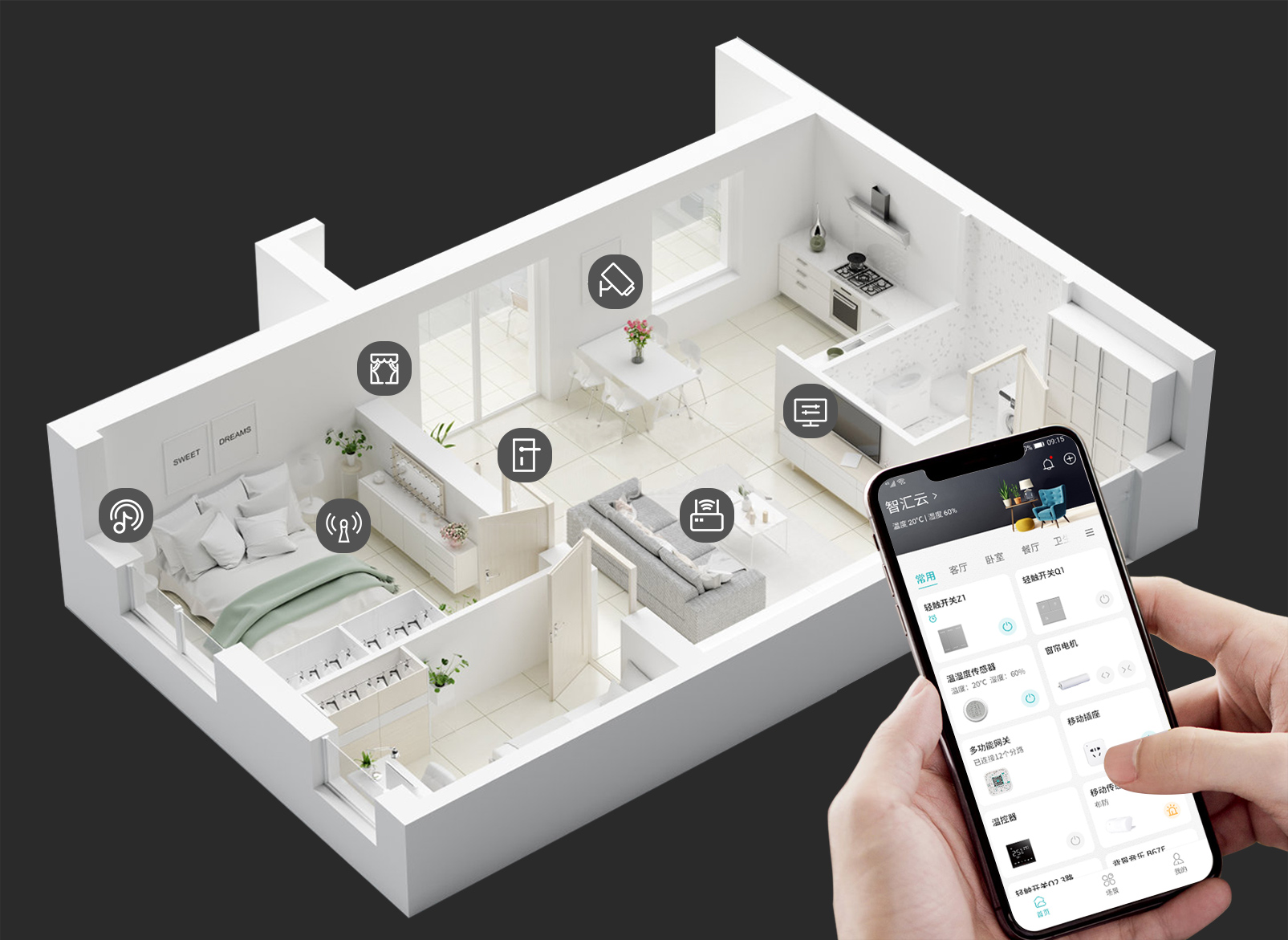 3499拉斯维加斯智能家居系统,采用完全自主研发的更符合智能家居场景的通讯协议EZ-Net,将家里的灯光、窗帘、窗户、门锁、背景音乐、空调、电视等进行联动场景化控制,将日常生活定制成让你尽情享受的各种美好场景。