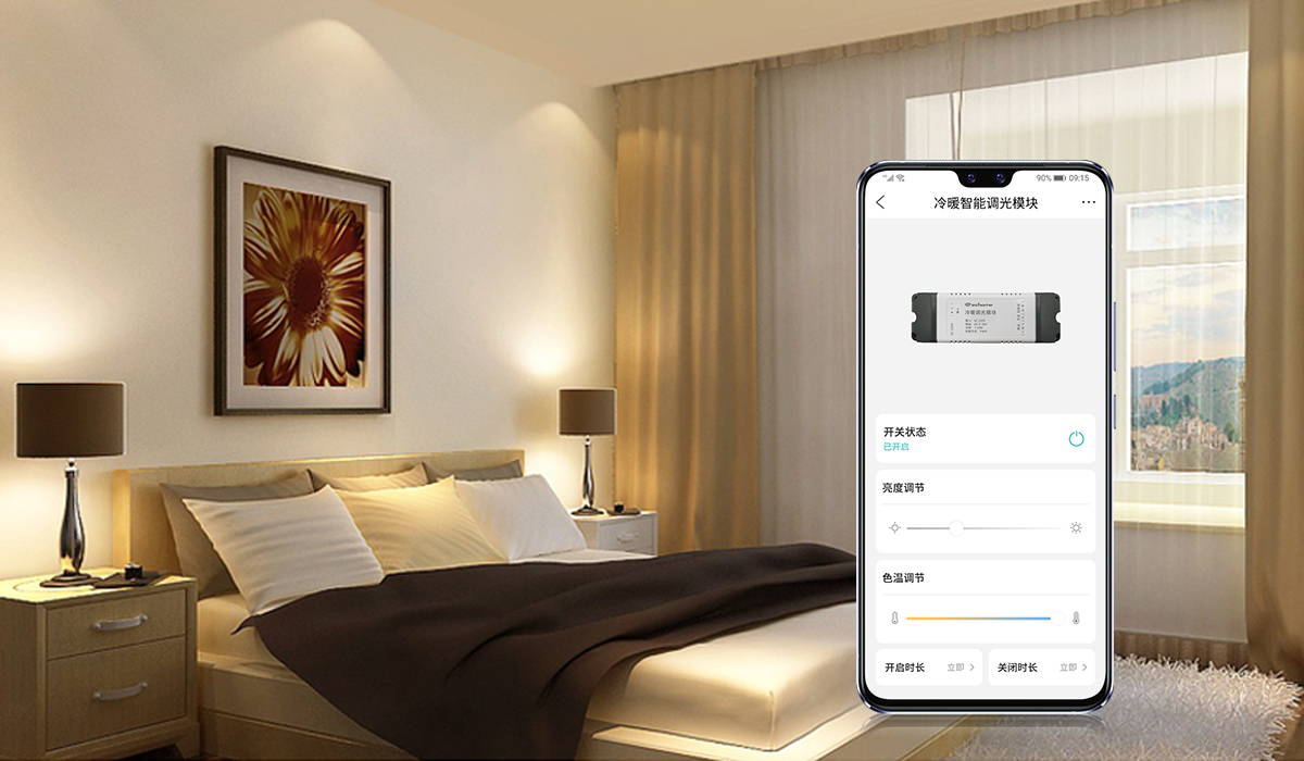 如果想要调节灯光的色温,可以选择冷暖调光模块。它可以搭配筒灯使用,调节多种灯光模式,比如冷色和暖色等。还可以根据场景和需求,在APP中设置延时控制,实现更丰富的场景体验。