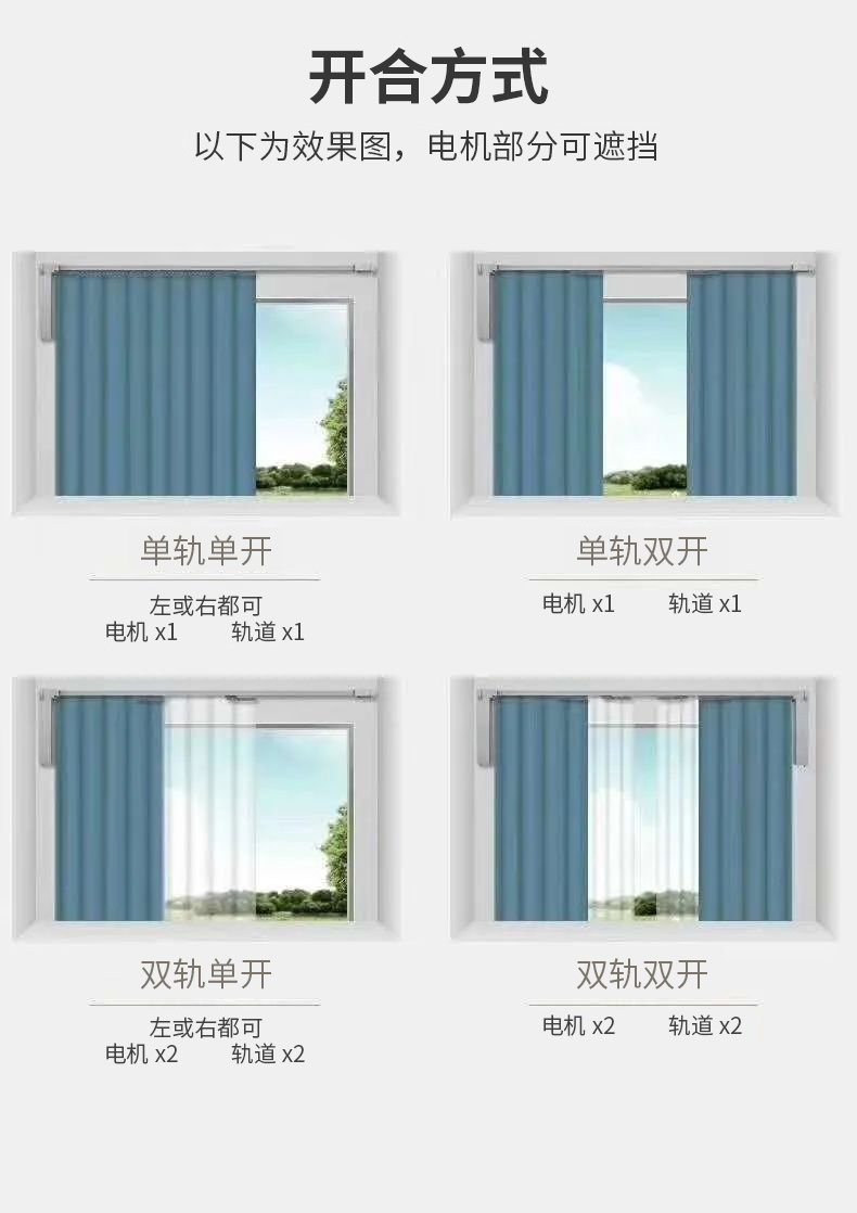 窗帘开合方式,包括单边开合和双边开合。客户可以根据自己的喜好,选择不同的窗帘开合方式。
