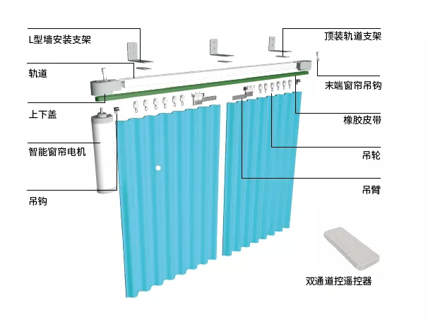 安装配件:L型墙安装支架、顶装轨道支架、轨道、末端窗帘吊钩、上下盖、橡胶皮带、智能窗帘电机、吊轮、吊钩、双通道遥控器