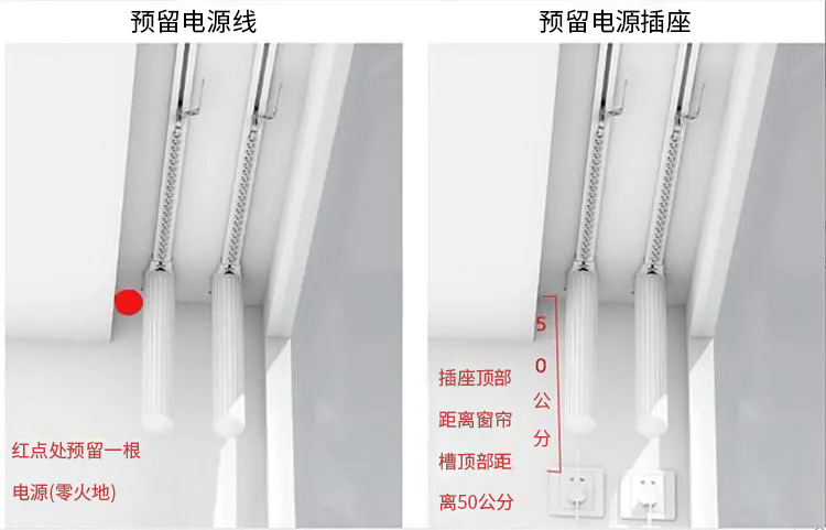 (5)安装需要预留至少一个电源插头,插座顶部需距离窗帘槽顶部50CM