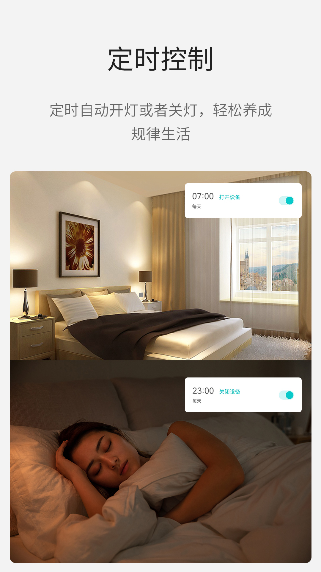 设置定时开关灯:通过预先设置时间定时控制全屋灯光,例如晚上11点入睡前自动关闭灯光。