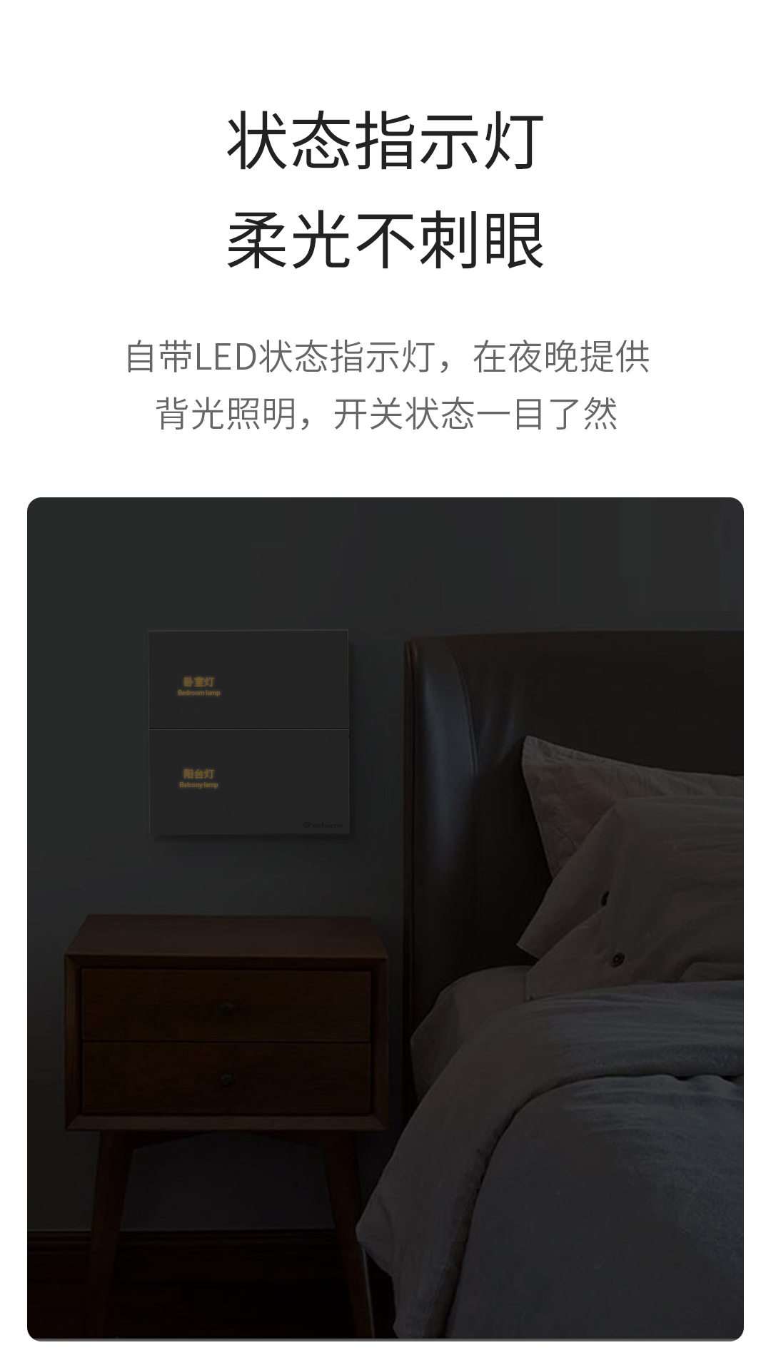 内置LED状态指示灯实时反馈开关状态,在夜晚发出微微亮光,轻松找到开关位置。