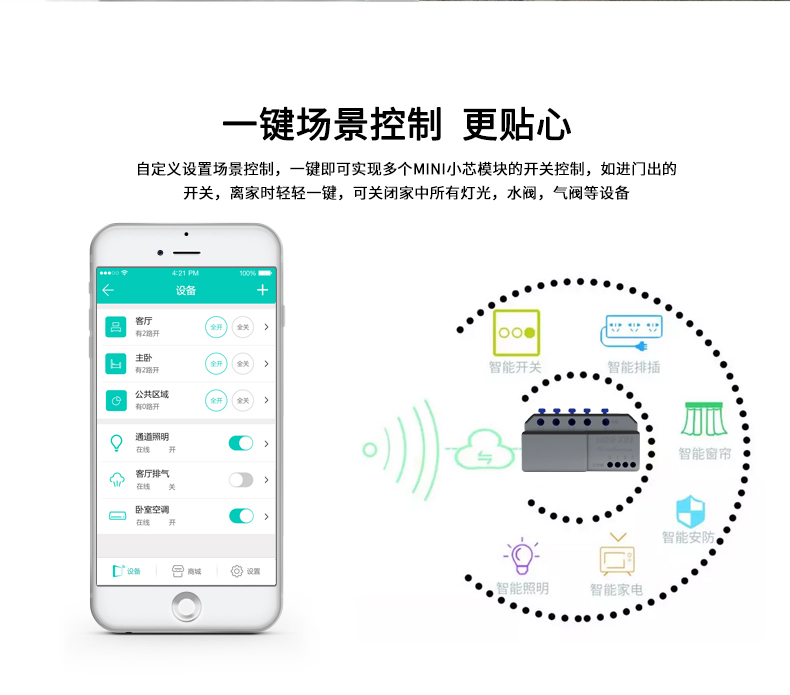 智能复位开关可自定义设置场景模式,可实现对多个设备进行统一控制,只要安装在门口玄关处或床头,当要出门时可一键情景开关就能执行你想要的离家模式,可关闭相应灯光、窗帘、水阀等家居设备。