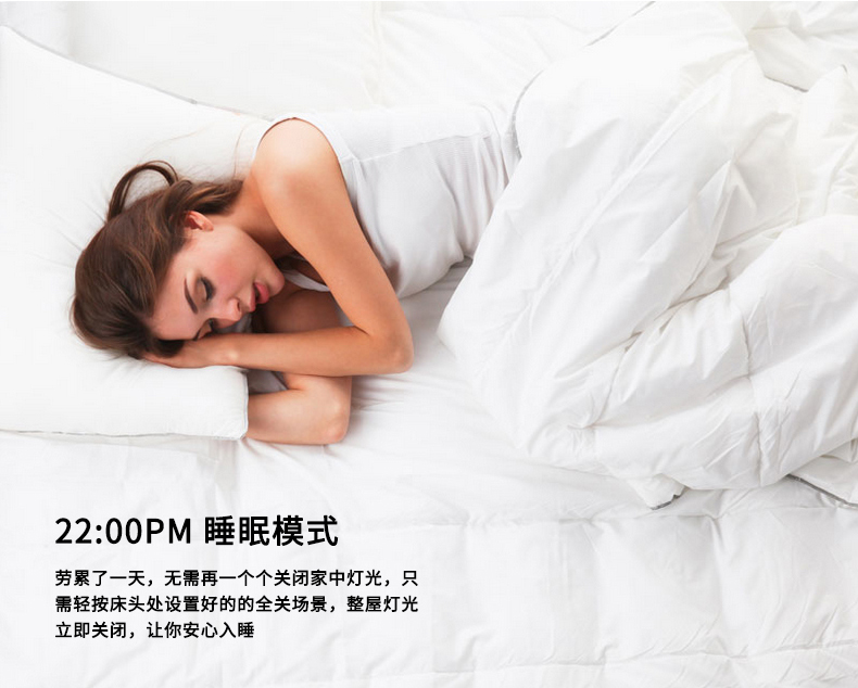 场景联动控制模块,设备与设备间仅需简单设定,即可实现场景联动控制,自定义设置场景模式,打造全方位智能化生活场景。举个例子,自定义编辑完成,起床模式:早晨七点,灯光便亮起,窗帘缓缓拉开,早晨第一缕阳光铺面而来;早晨八点,上班出门,无需逐一检查灯光家电是否关闭,仅需设置好离家模式,即可自动关闭所有设备,甚至是水阀和气阀;傍晚六点半,下班回家模式开启,一键开启家中主要区域灯光及家电设备;晚上八点,晚饭过后,关闭其他区域灯光,窗帘缓缓拉上,独留舒适观影区域灯光,纵享惬意观影体验;晚上十点,开启睡眠模式,躺在床上,再不必逐一关闭家中灯光,仅需床头的一个按钮,或是手机APP控制,即可达到全屋灯光关闭。