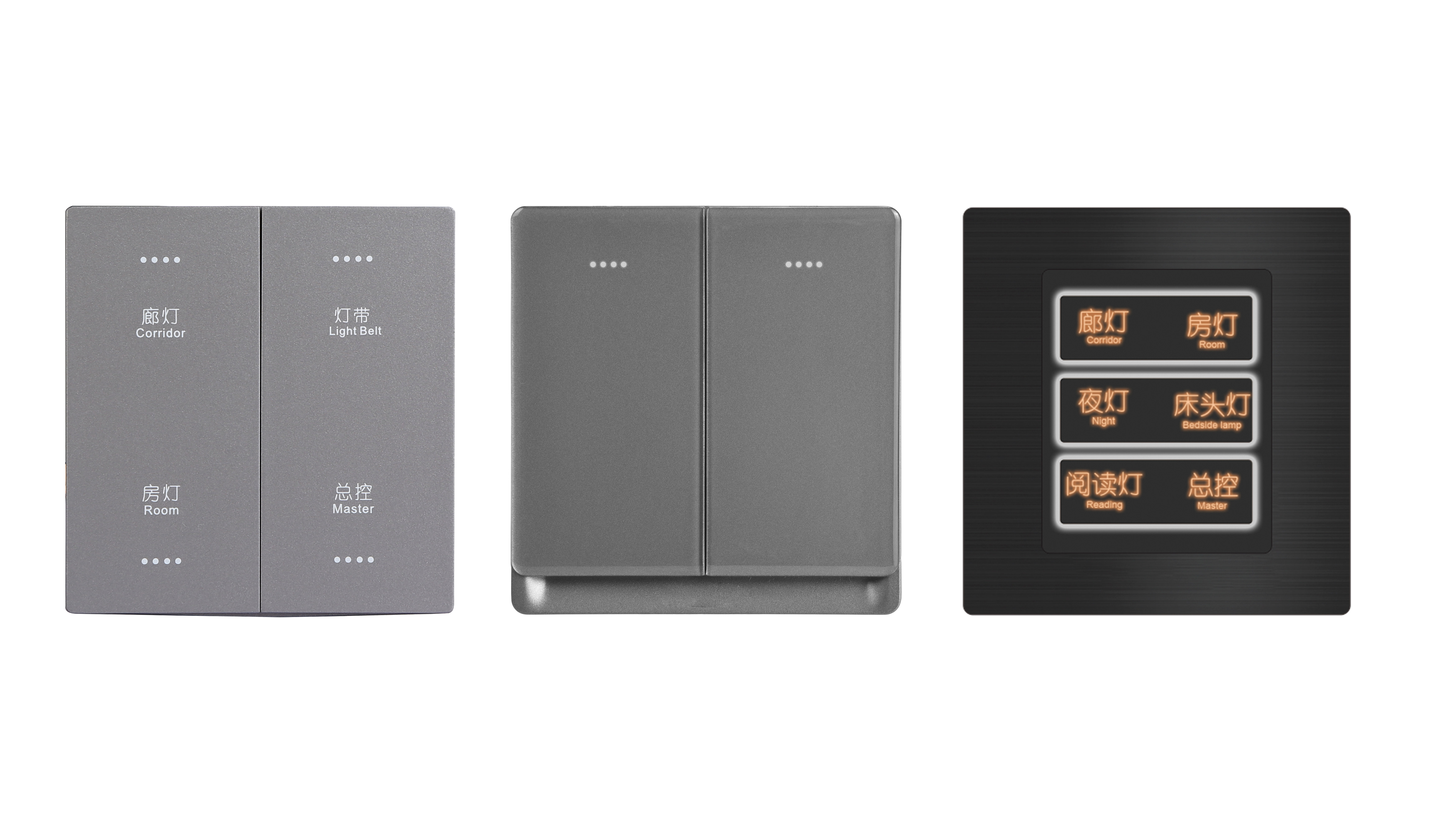 纯平式轻触面板,做工精细,面板边角线条流畅;按键也有背光灯实时显示开光状态,按压按键有鼠标轻点式回弹,反馈清爽利落;面板支持个性化定制,按键可根据需求刻上相应开关名称。
