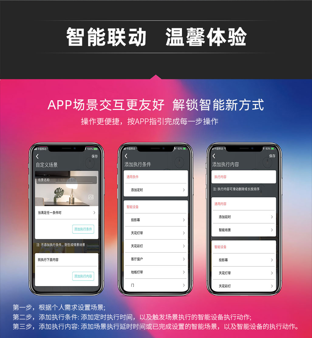 仅需按照APP指引,逐步完成场景模式编辑,三步达成智能场景联动