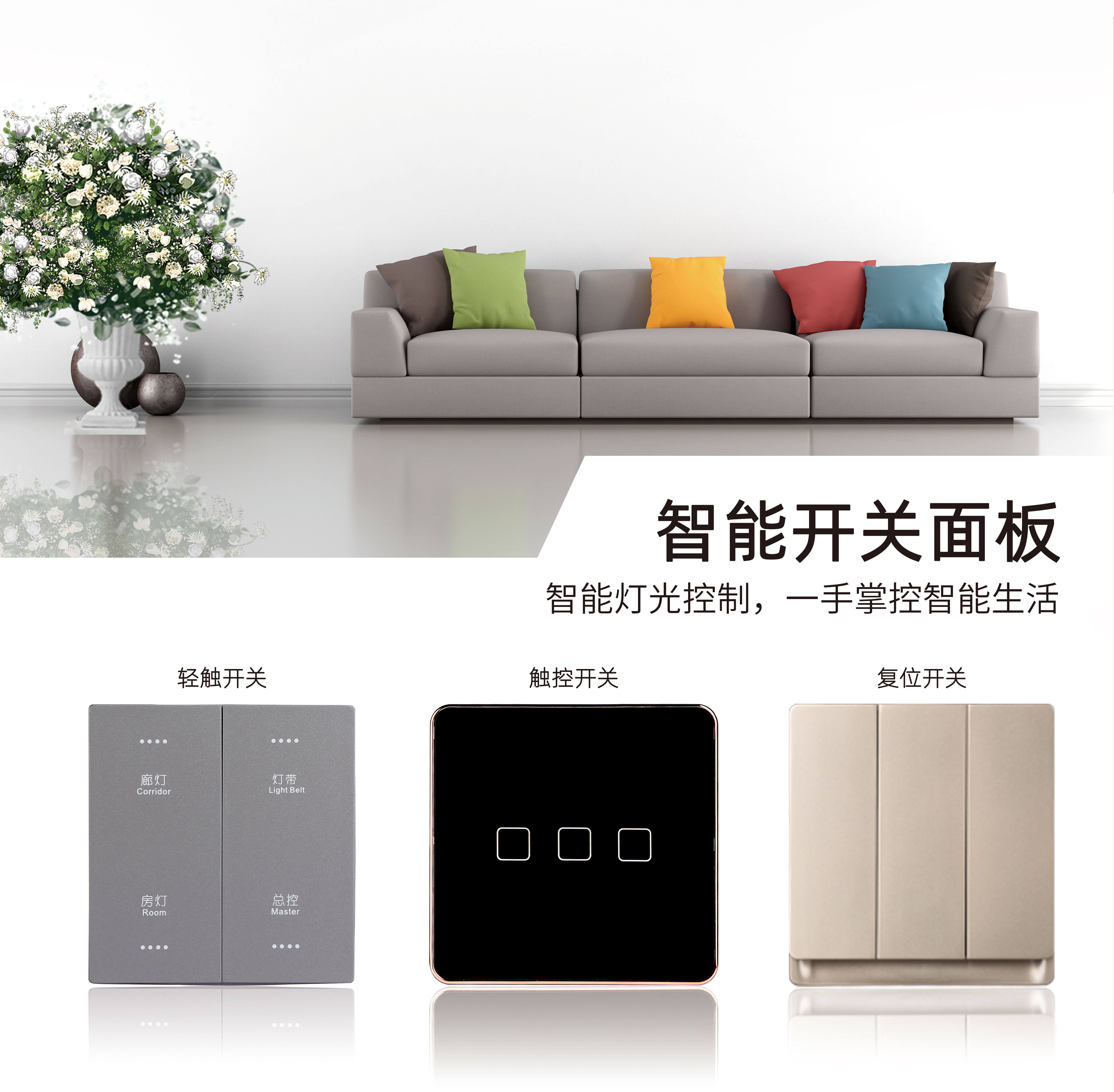 3499拉斯维加斯智能面板,可以作为普通面板控制某一路的灯光或设备;由于面板本身就自带处理功能,也可作为智能场景面板使用,搭配其他智能产品,通过简单场景编辑即可实现联动控制,一键控制全屋灯光及设备。外观则有触控、轻触以及复位面板多种类型,供不同用户需求进行选择。