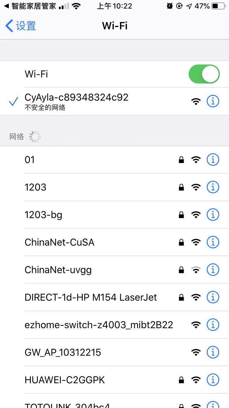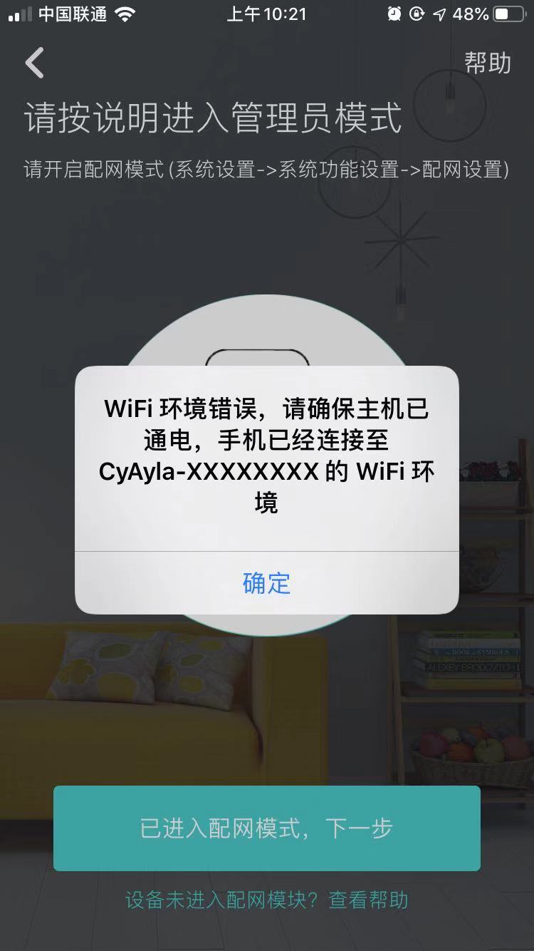 若弹框显示WIFI环境错误消息时,需先确保智能门锁已在开启状态,并将手机跳转至WIFI选择界面,选择对应弹框消息中对应WIFI,即可继续进行AP配网,等待配网完成点击下一步。