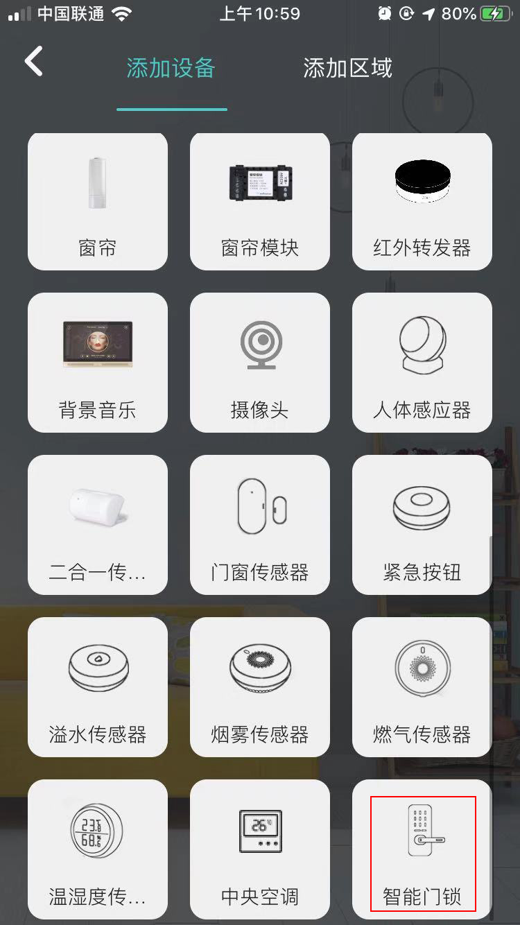 点击APP下方设备栏,再点击右上方“+”键,找到并选择智能门锁设备。