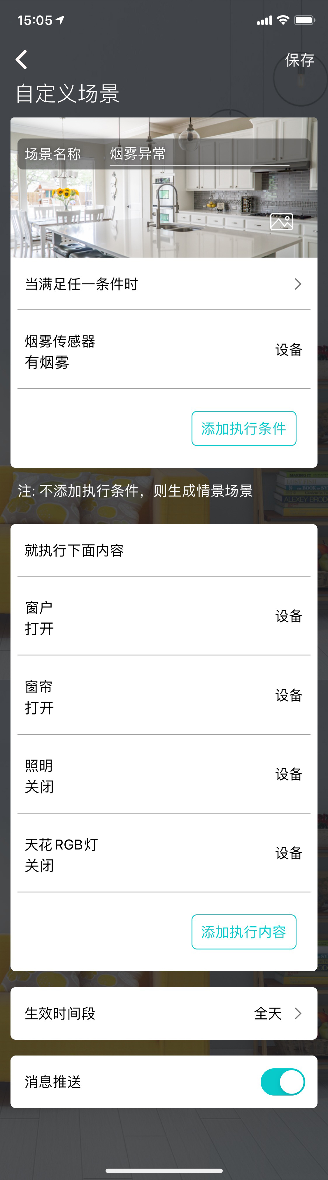 烟雾传感器可以在感应异常烟雾出现时,联动让关联区域内的电器断电;用户在收到报警推送后可以及时求助,处理紧急情况。