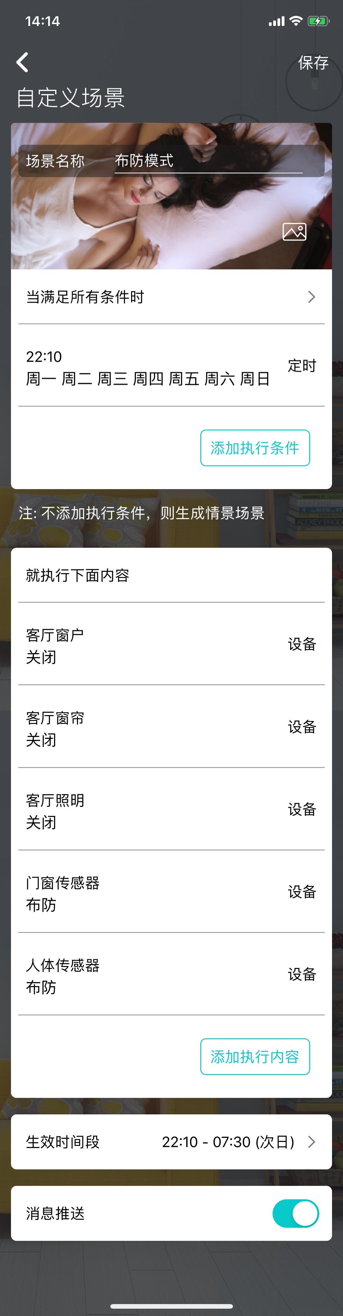 当然,想要安心睡眠,更要关注一下屋内的安防,手机APP开启“布防模式”,门磁传感器、摄像头的布防状态,一夜安枕无忧。