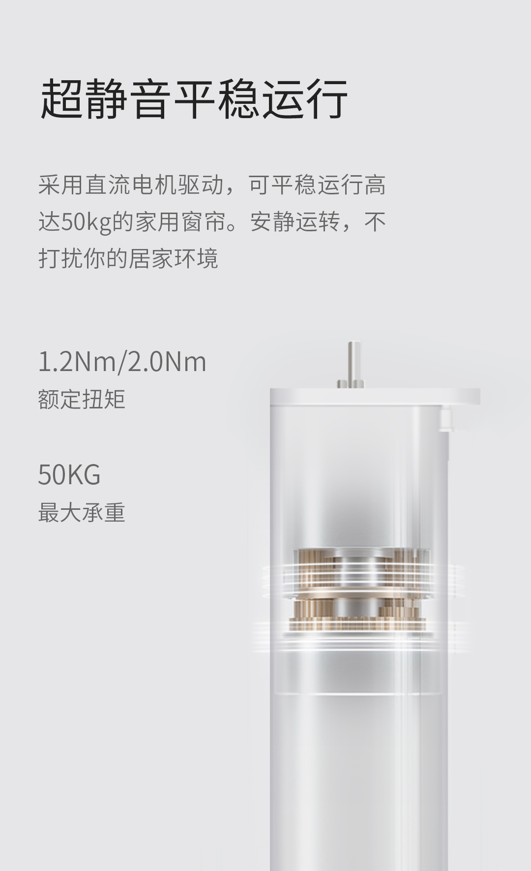 电机运转产生的扭矩越大,能带动的窗帘重量就越大。扭矩1.2N.m/2N.m的窗帘电机,传动效率高,最长可支持8米窗帘轨道,可应用在超高平层。
