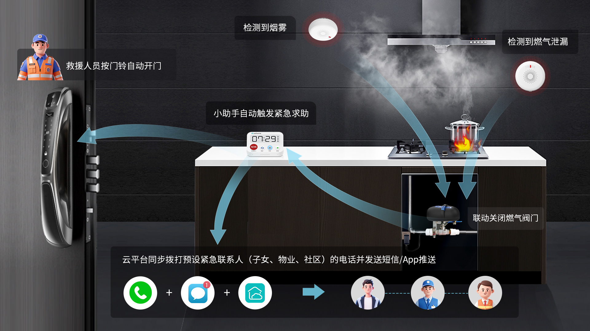 多数产品仅支持单点触发,而我们的设备间可实现“矩阵式协同”。 比如:险情自动化处理: 当烟雾/燃气传感器检测到险情 → 首先关闭燃气阀门→系统即刻自动触发SOS报警→ 云平台同步拨打预设的子女、物业、社区电话并发送APP推送 → 救援人员赶到后,可通过触发智能门锁的特定权限(如门铃按键开门)无阻碍进入,为生命救援抢得黄金时间。