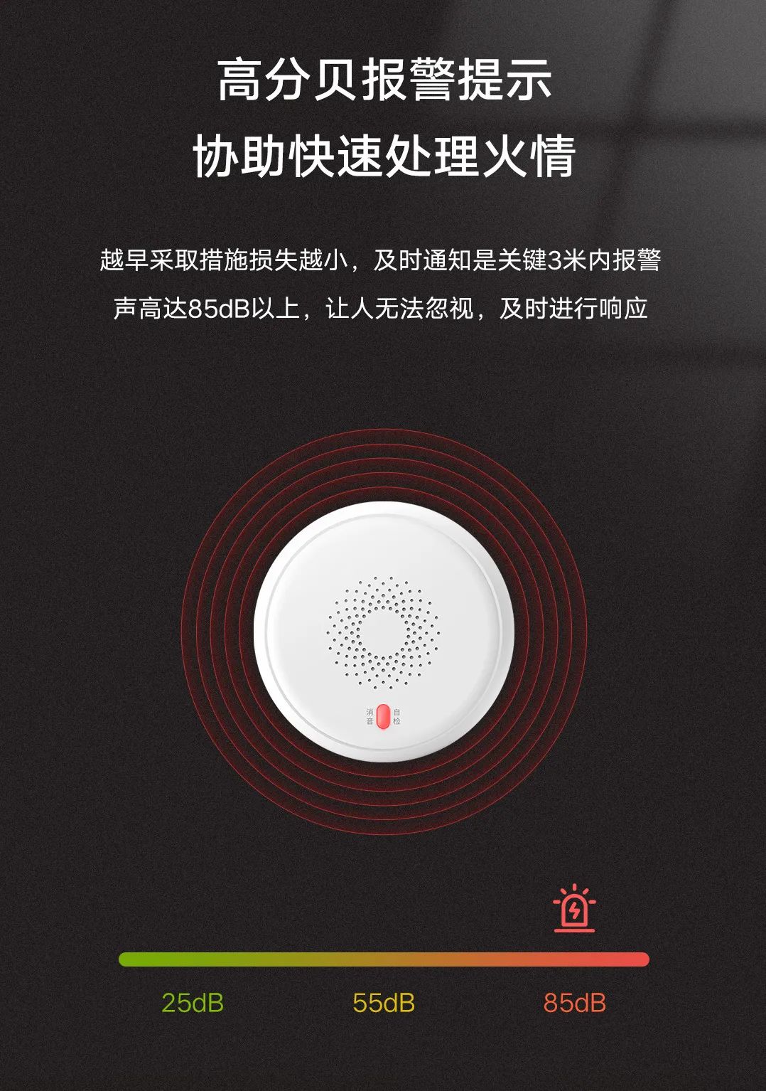烟雾传感器时刻监测区域内的可燃气浓度,检测到烟雾浓度超标将会发出高分贝蜂鸣告警音,并及时推送报警提醒至用户,及时处理遏止火灾险情。