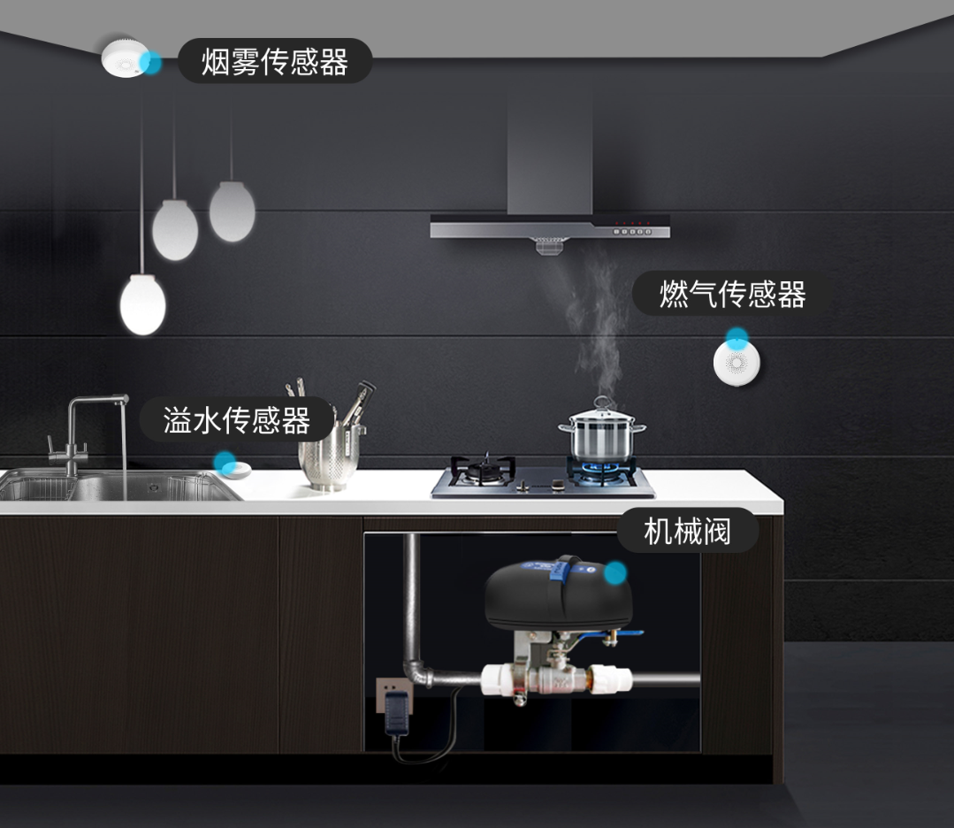 3499拉斯维加斯厨房安防套装(燃气传感器、烟雾传感器、溢水传感器、机械阀、智能开关、网关)能有效防范燃气泄漏、烟雾火灾、漏水溢水等安全隐患,全方位守护家庭安全,营造一个安全的厨房使用环境。