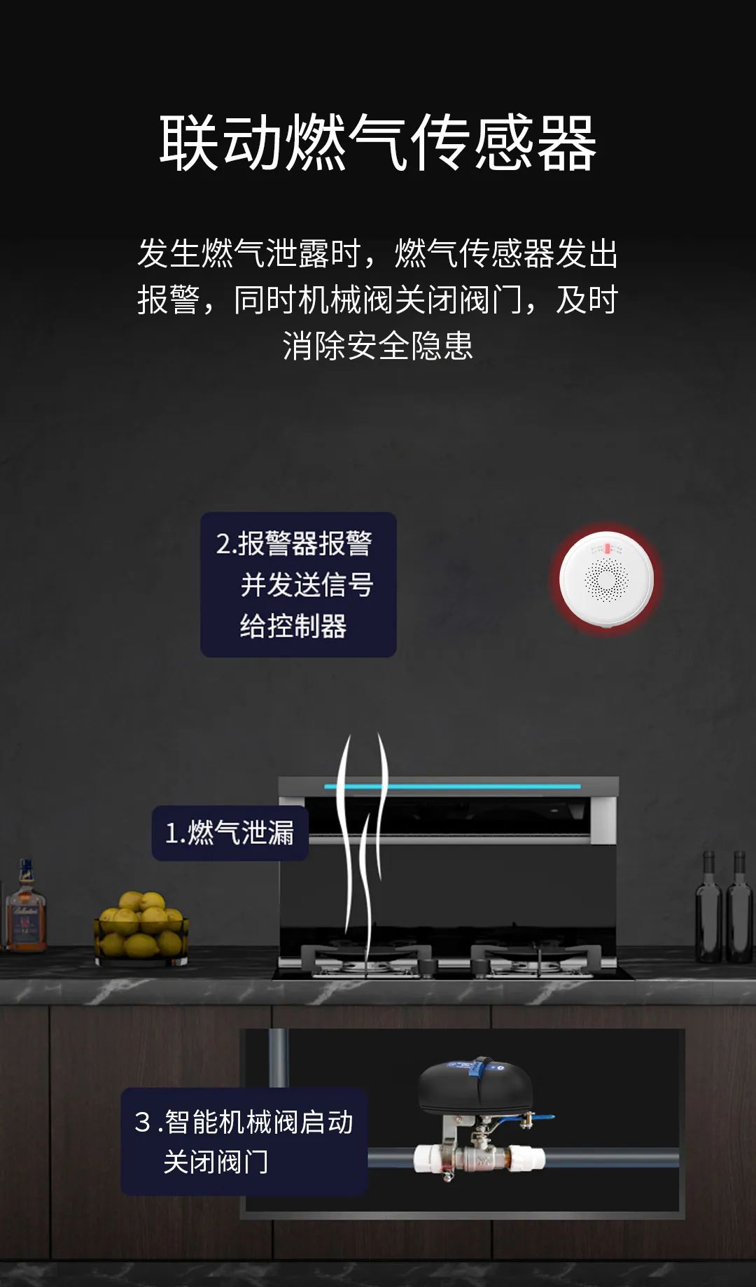 另外,搭配机械阀,还可以控制燃气阀门开关,与燃气传感器联动,在检测到燃气泄漏后,可自动关闭燃气阀门,化解煤气泄漏带来的安全问题。