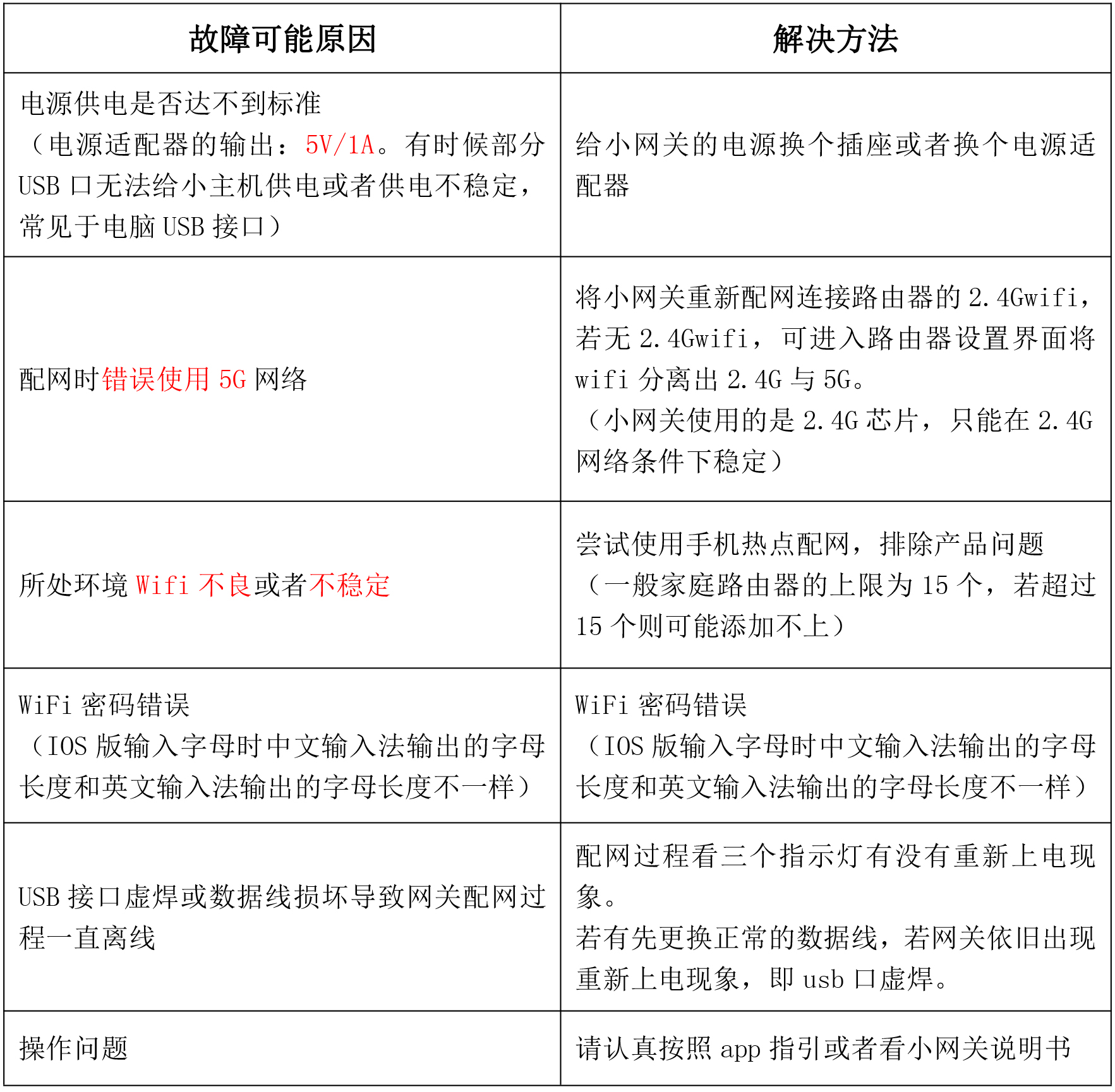 ① 确保网关当前网络正常稳定,且小网关电源正常稳定;